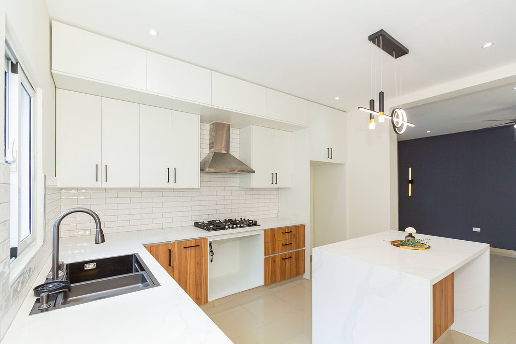 The home includes a modern kitchen with waterfall quartz island, seamlessly connecting to the open living and dining area, creating a perfect space for entertaining or relaxing with family. All bedrooms are equipped with air conditioning and ceiling fans for year-round comfort.
