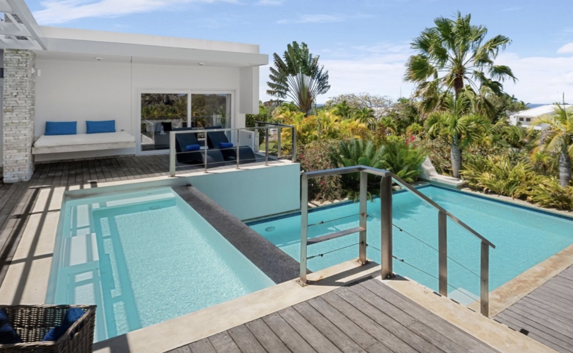Step outside to a beautifully arranged main terrace that connects seamlessly to the dining space, creating the perfect indoor-outdoor flow. The patio is furnished for both relaxation and entertaining, centered around a refreshing pool with a built-in jacuzzi. A split level pool adds a soothing touch to the overall ambiance.