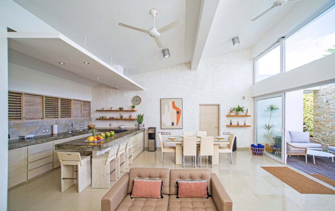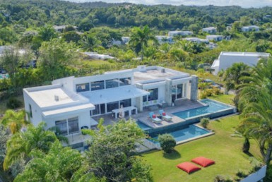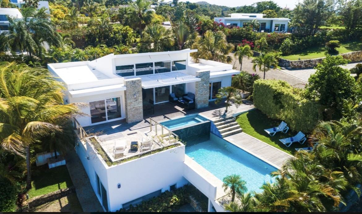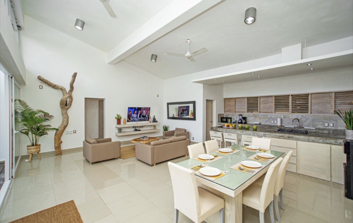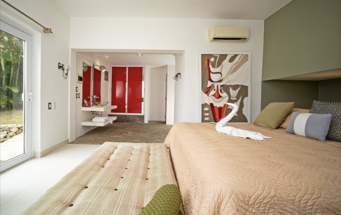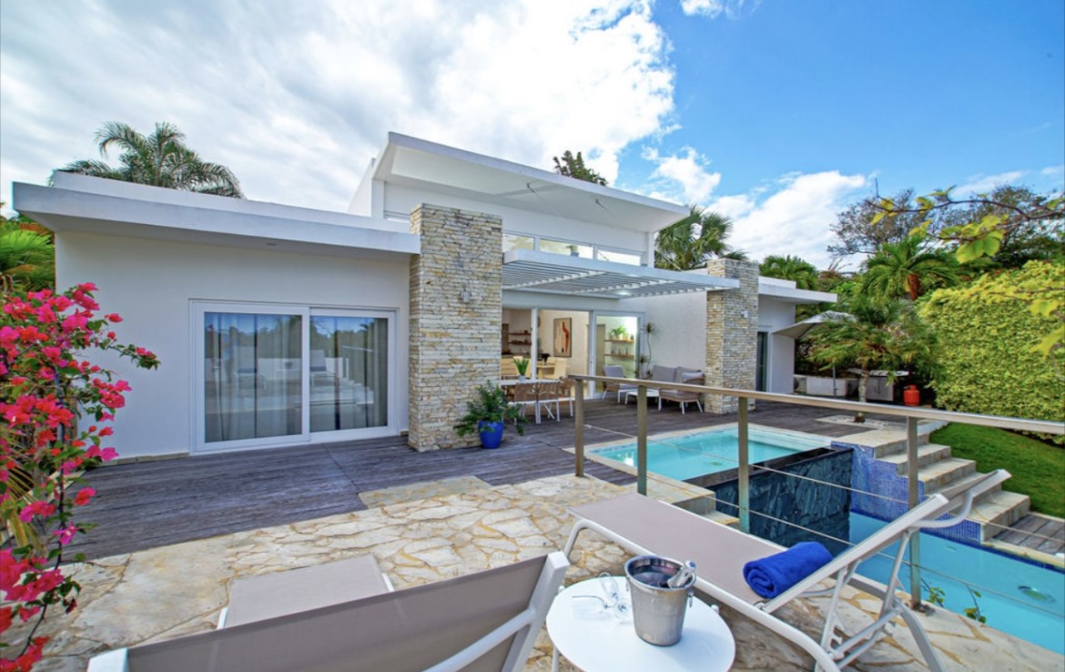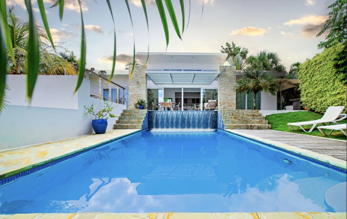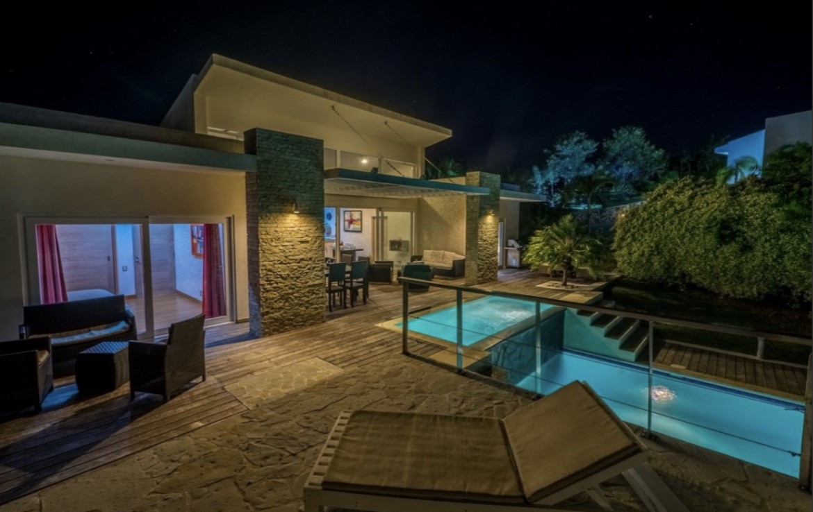 The dining area flows seamlessly onto the main outdoor patio, where you can unwind among stylish furnishings and enjoy the serene setting. A sparkling pool with an integrated jacuzzi serves as the centerpiece, and a cascading waterfall connects it to a second pool, enhancing the tranquil atmosphere.