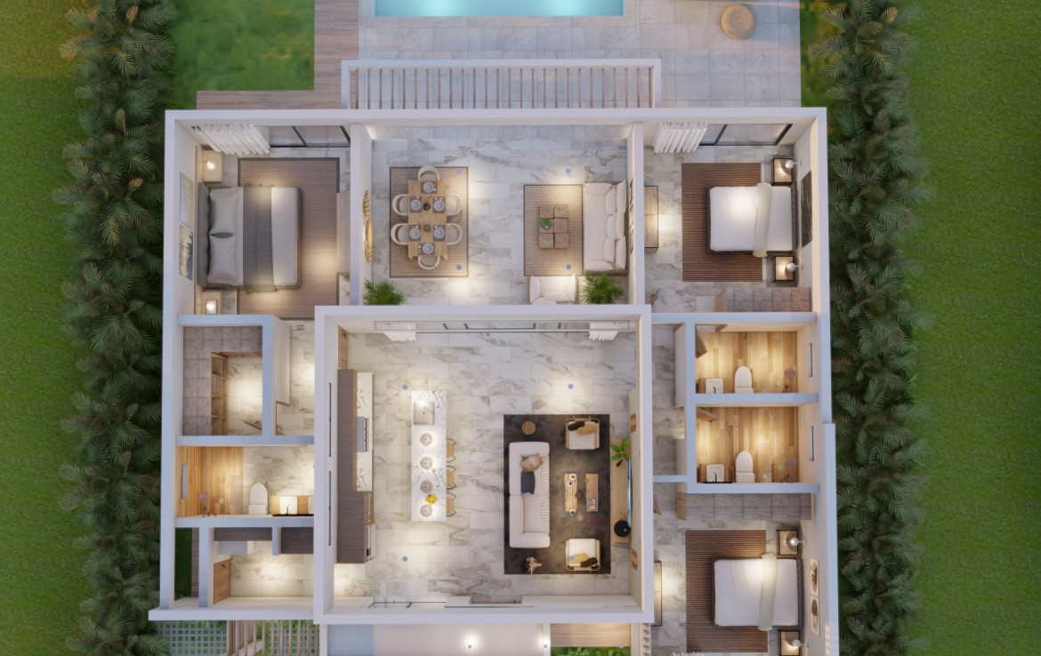 Boasting premium exterior and interior finishings, the villa showcases precious wood doors and kitchen furnishings. High-end accessories adorn the kitchen and bathrooms, with coralina stone adorning the bathroom walls from floor to ceiling. The expansive living and dining areas feature double-height ceilings, creating an open and spacious ambiance.
