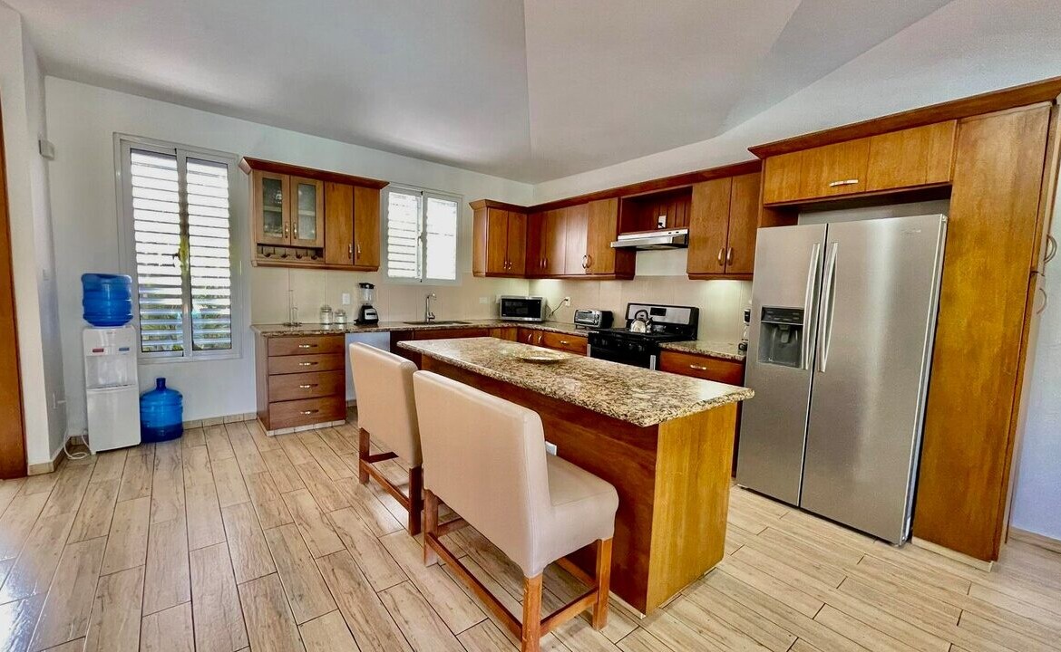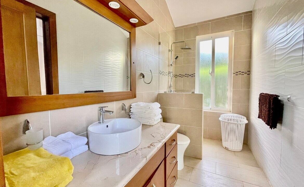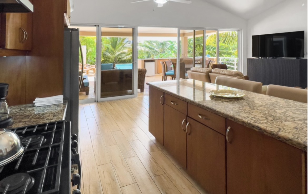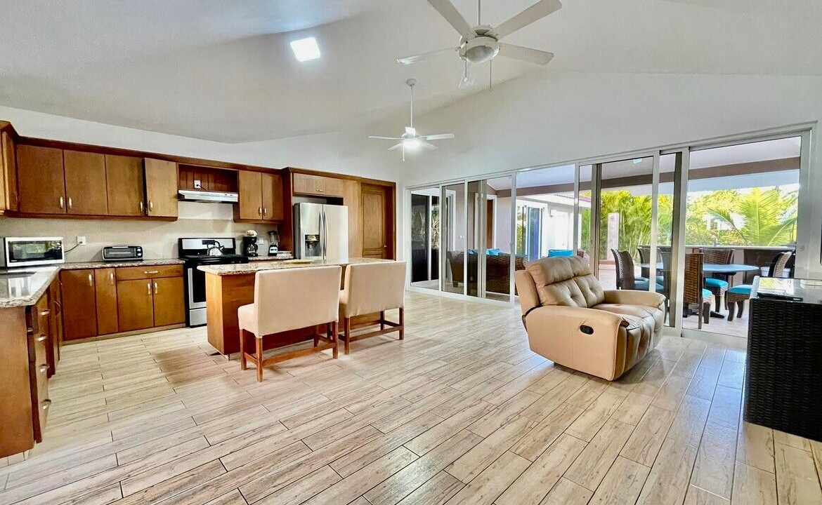 Set on a 594 m² lot, the property is surrounded by mature tropical landscaping that creates a peaceful and private retreat. The expansive outdoor living space is designed for year-round enjoyment, featuring a large private swimming pool, a covered terrace with ample seating, and a dedicated outdoor bar perfect for entertaining guests. The layout maximizes natural shade and airflow, delivering a seamless indoor–outdoor Caribbean lifestyle experience.